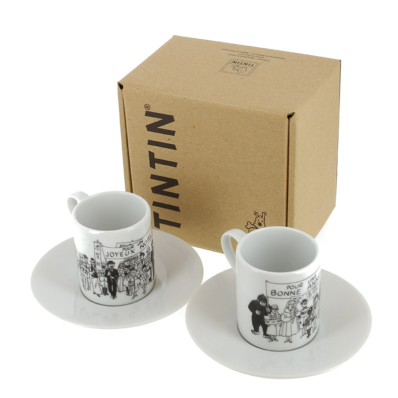 Set of 2 espresso cup and saucer featuring images that inspired by the greeting card designed in 1972 by Hergé and representing all the characters in the world of Tintin.